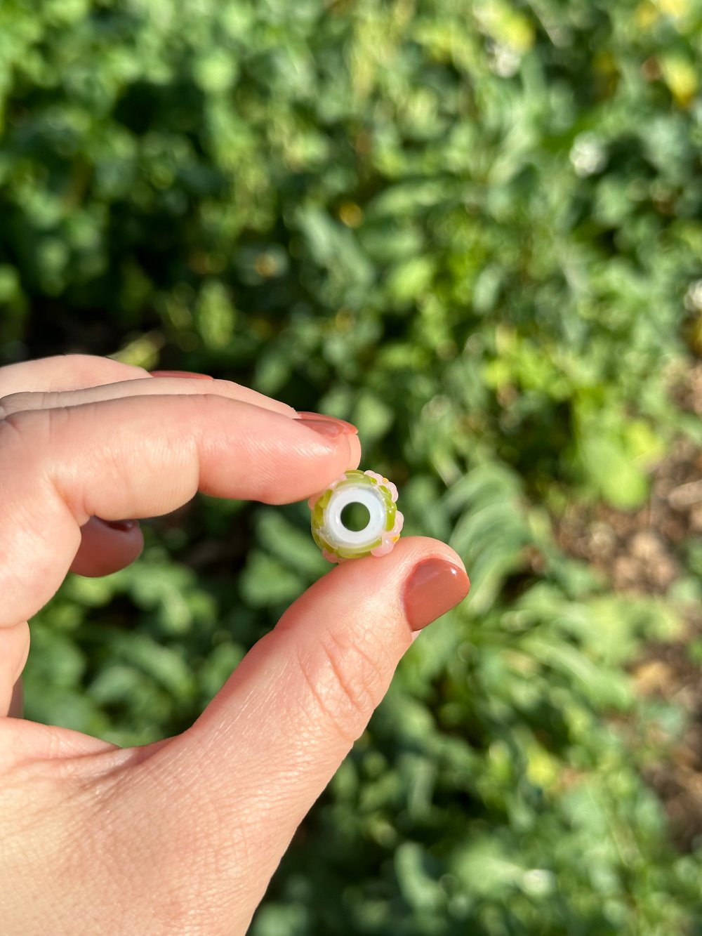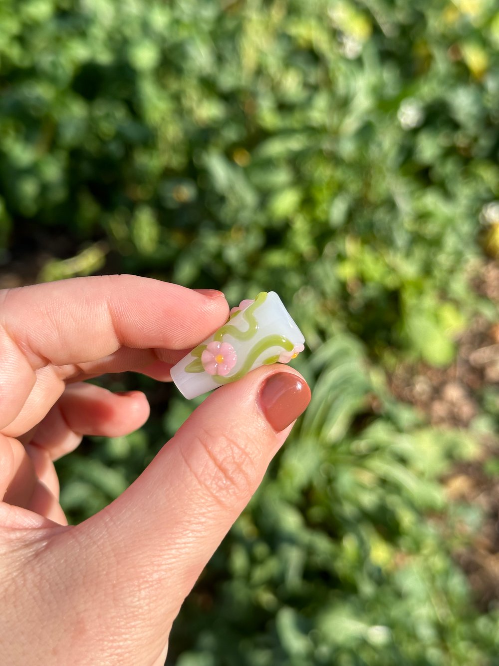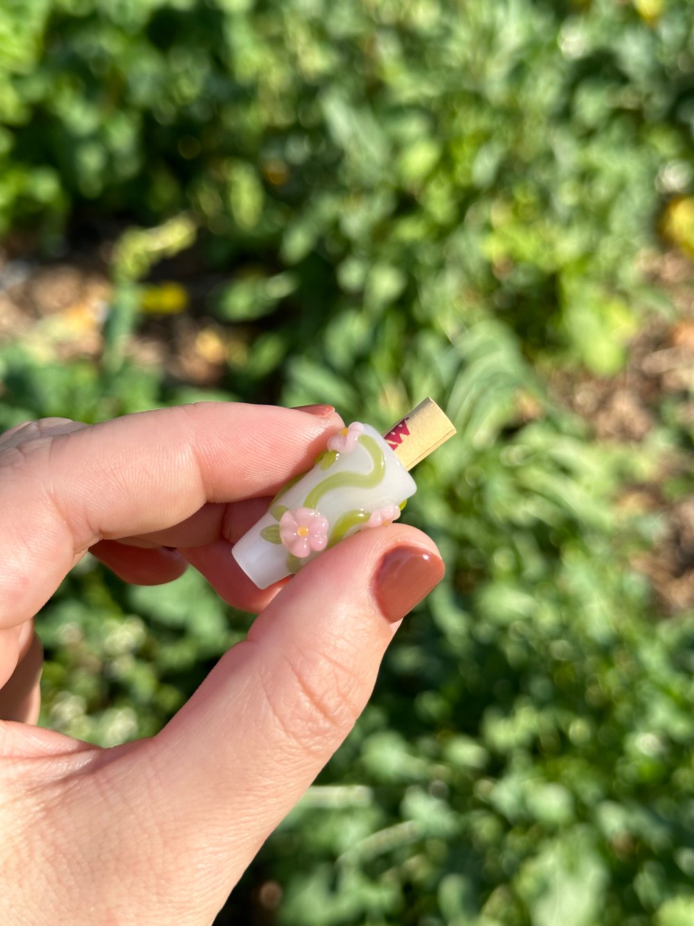 Four pink flowers on a milky white base, with vine and leaf detailing. The inside is tapered to fit multiple sizes. Comes with pre rolled tips and a black ball chain.