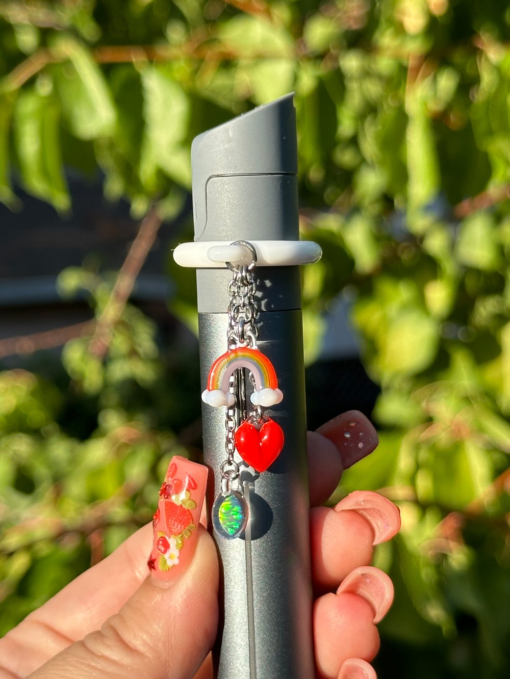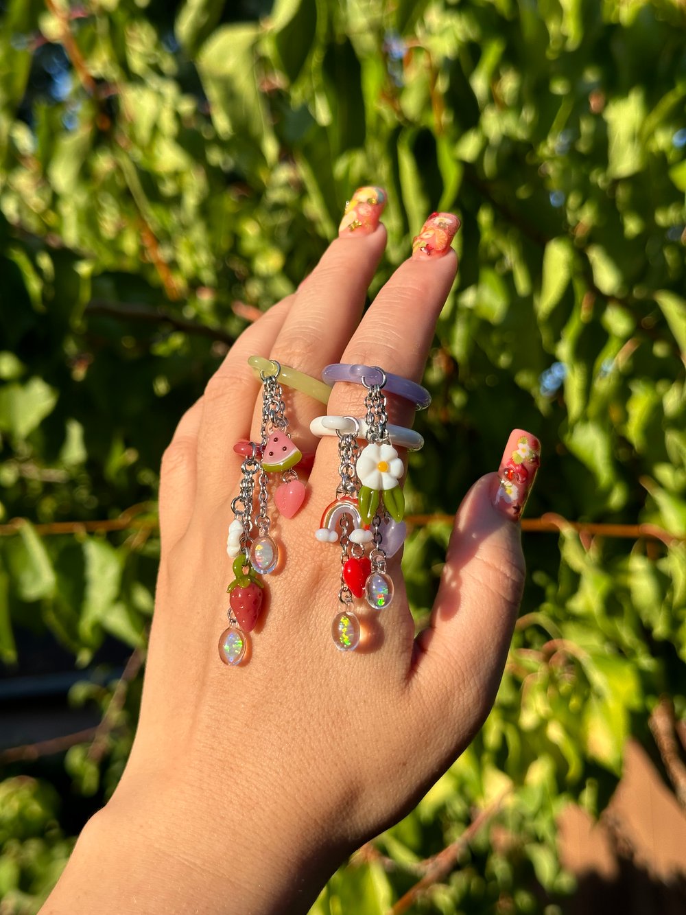Each one has a cute charm with a matching heart and sparkly opal (uber blush has a flower instead of a heart). If you’re a size 9.5 in rings, you can wear them as well. All hardware is 100% stainless steel, and very durable.