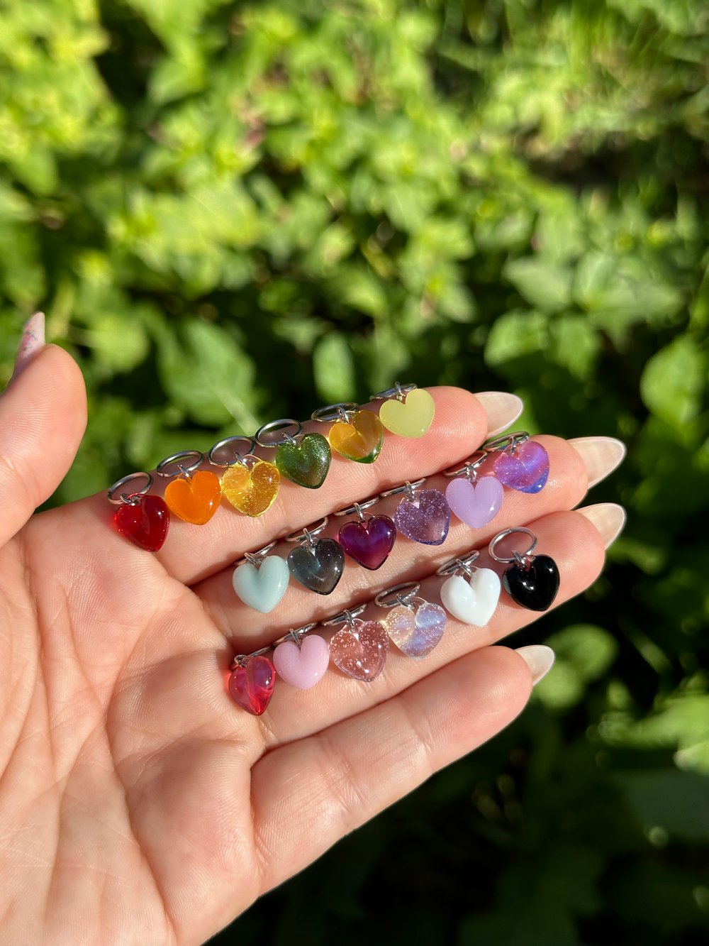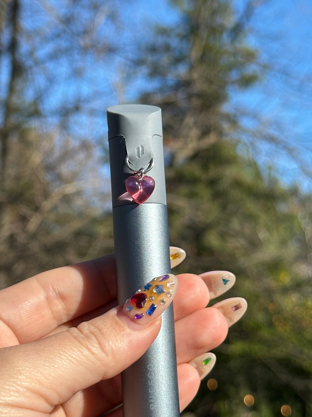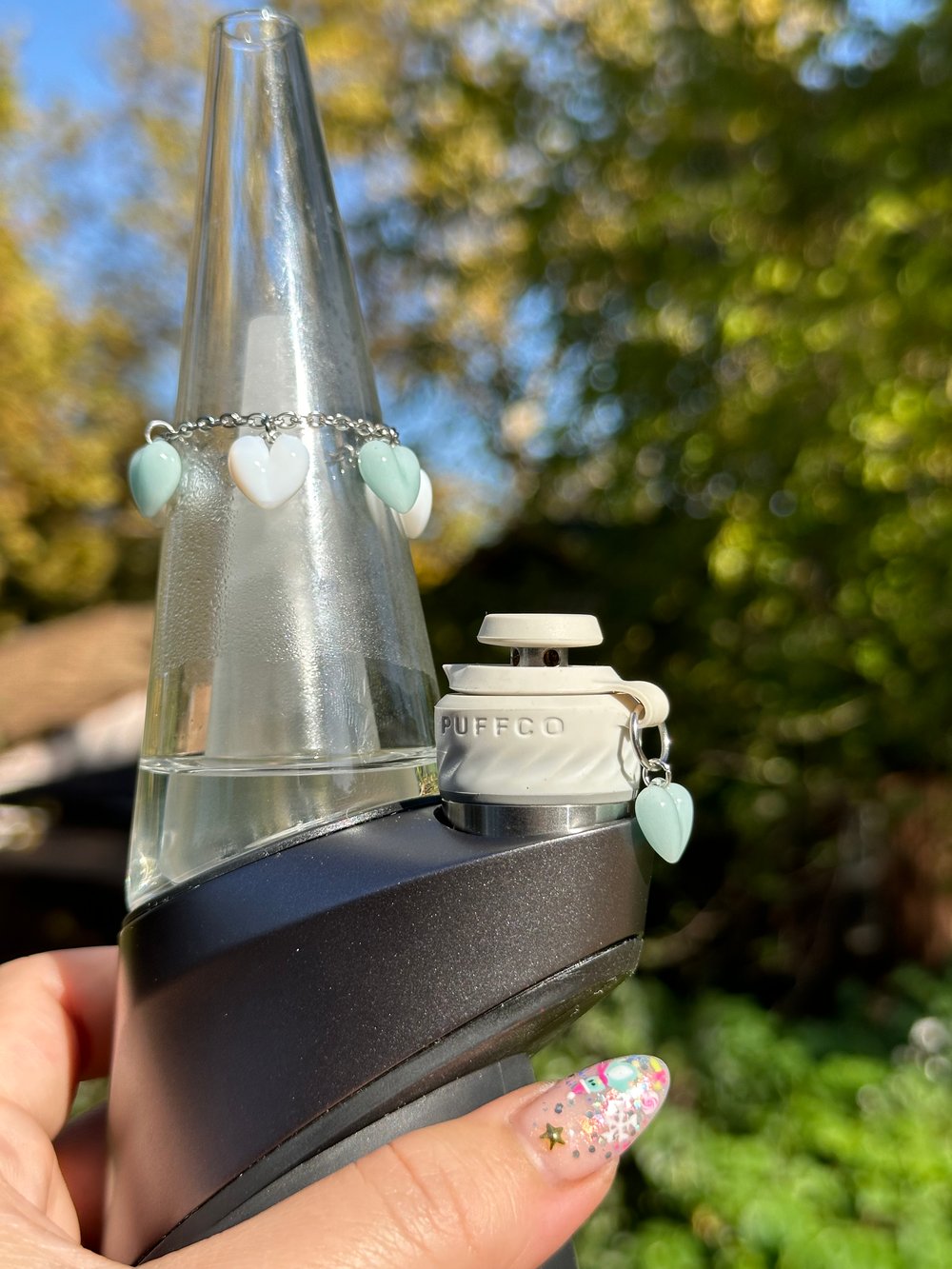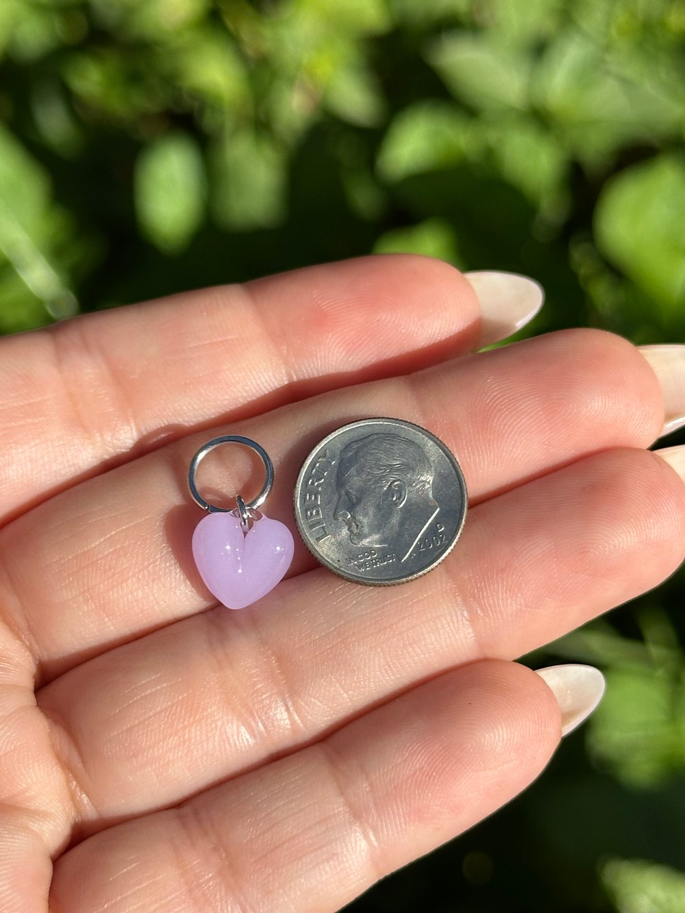 Micro heart charms, available in 18 colors. These go onto an atomizer toggle on a Puffco Peak, Carta, or similar e rig. Made with borosilicate glass and 100% stainless steel hardware. If you would like to use it on your handheld pivot device, please specify in the notes so I can send the correct size jump ring, as it is larger than the one for the peak.